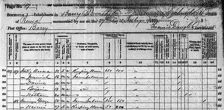 ANNA FERTICH RECORDED IN THE 1870 PA CENSUS