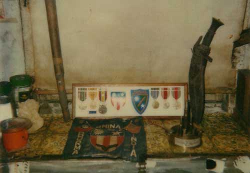 war medals, dah on left, kukri on right and bullet ash tray that he made